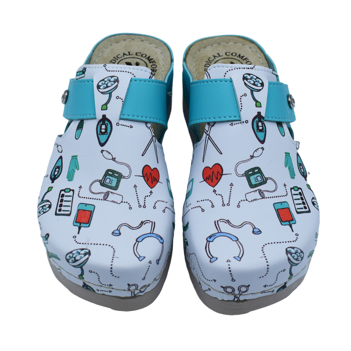 Ανατομικά σαμπό σε άσπρο χρώμα με ιατρικά σχέδια και γαλάζιες λεπτομέρειες, ιδανικά για όσους δουλεύουν σε χώρους ιατρικής περίθαλψης! Αποτελούν μια ιδανική επιλογή τόσο για το σπίτι όσο και για εξωτερικούς χώρους δεδομένου ότι αφενός η χρήση τους είναι κατάλληλη για πολύωρη ορθοστασία κι αφετέρου συμβάλλει στην άνεση του ποδιού. Ακόμη και μετά από παρατεταμένη χρήση δεν προκαλούν εξάντλησης.Τα συγκεκριμένα σαμπό περιέχουν γνήσιο δερμάτινο, μαλακό, αναπαυτικό πατάκι με memory gel και απορροφητική ιδιότητα. Το υλικό του πάνω μέρους αποτελείται από αδιάβροχο συνθετικό δέρμα. Διαθεσιμο σε τυρκουάζ καί μαύρο χρώμα