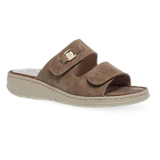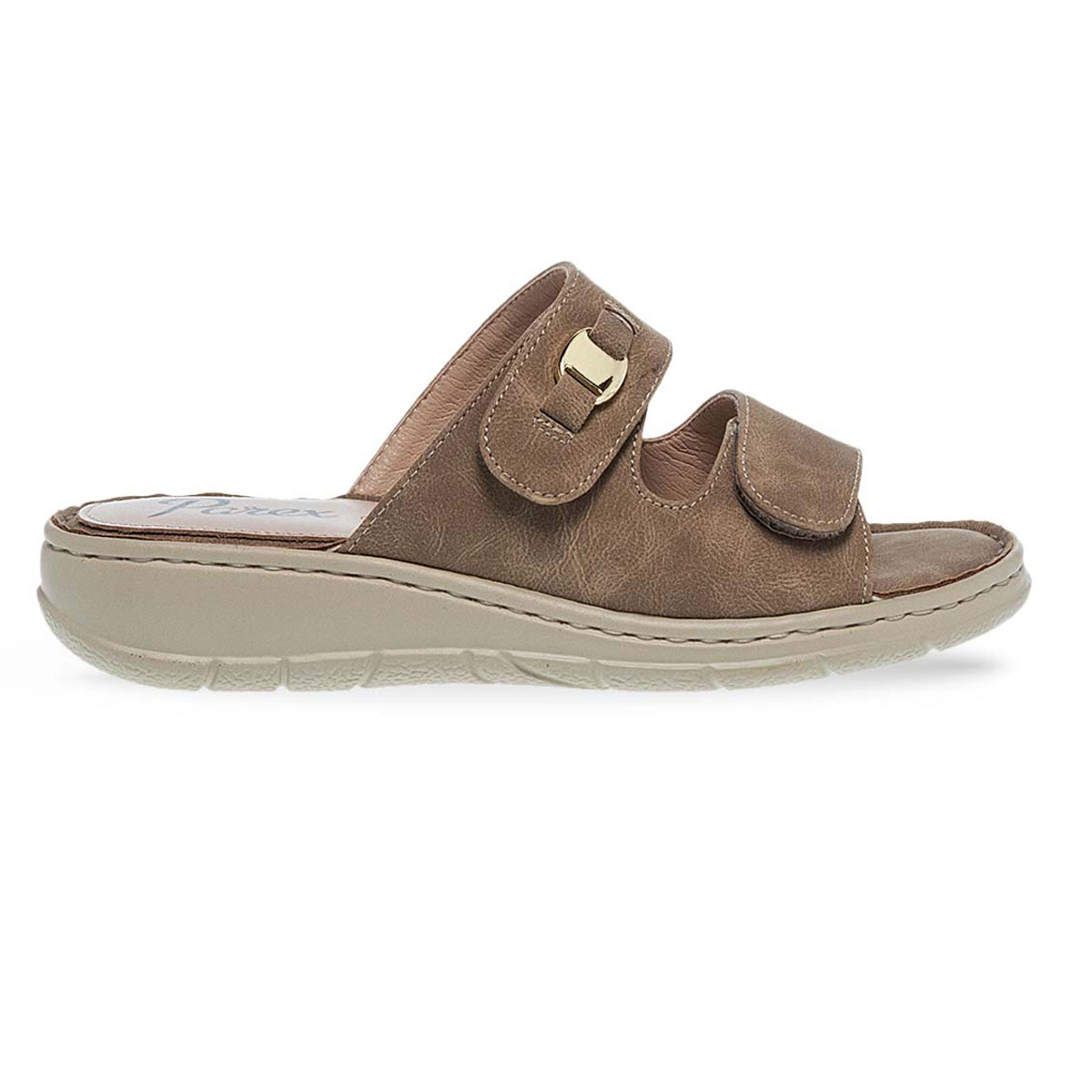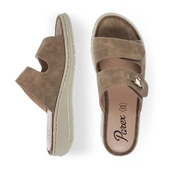 Γυναικεία Comfort πέδιλα Parex ,με δυο λουράκια velcro γιά να ρυθμίζει απόλυτα στό πόδι αλλά καί μοντέρνο διακριτικό διακοσμητικό στό επάνω μέρος.Εξωτερικά είναι σχεδιασμένες από συνθετικό δέρμα ενώ εσωτερικά έχουν δερμάτινο πάτο ανατομικών προδιαγραφών. Μια διαχρονικη και ταυτόχρονα κλασσική δημιουργία, που είναι απαραίτητη στη καλοκαιρινή σας συλλογή. Με μαλακό και ανατομικό πέλμα, εύκαμπτα, ραμμένα στο χέρι. Διαθέσιμη σε πούρο και σομών χρώμα