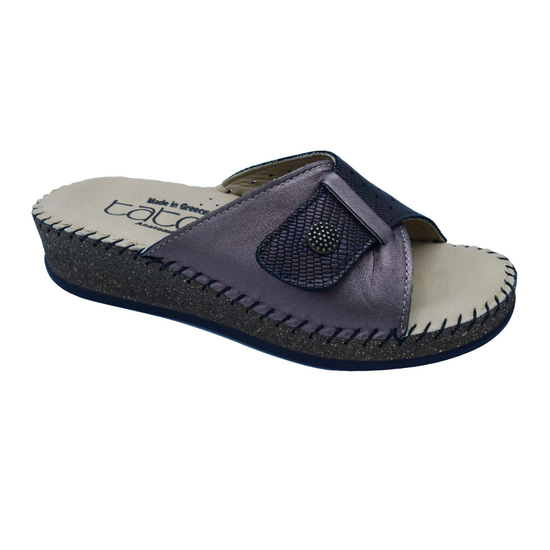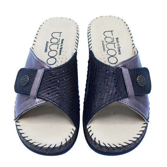 Γυναικείες Comfort δερμάτινες Παντόφλες Tatoo , με velcro στη φάσα πού είναι η μισή διάτριτη.Εξωτερικά είναι σχεδιασμένες από δέρμα , ανατομικών προδιαγραφών. Μια διαχρονικη και ταυτόχρονα κλασσική δημιουργία, που είναι απαραίτητη στη καλοκαιρινή σας συλλογή.Με μαλακό και ανατομικό πέλμα, εύκαμπτα, ραμμένα στο χέρι.Διαθέσιμη σε Ατσαλί μπρονζέ και μαύρο χρώμα