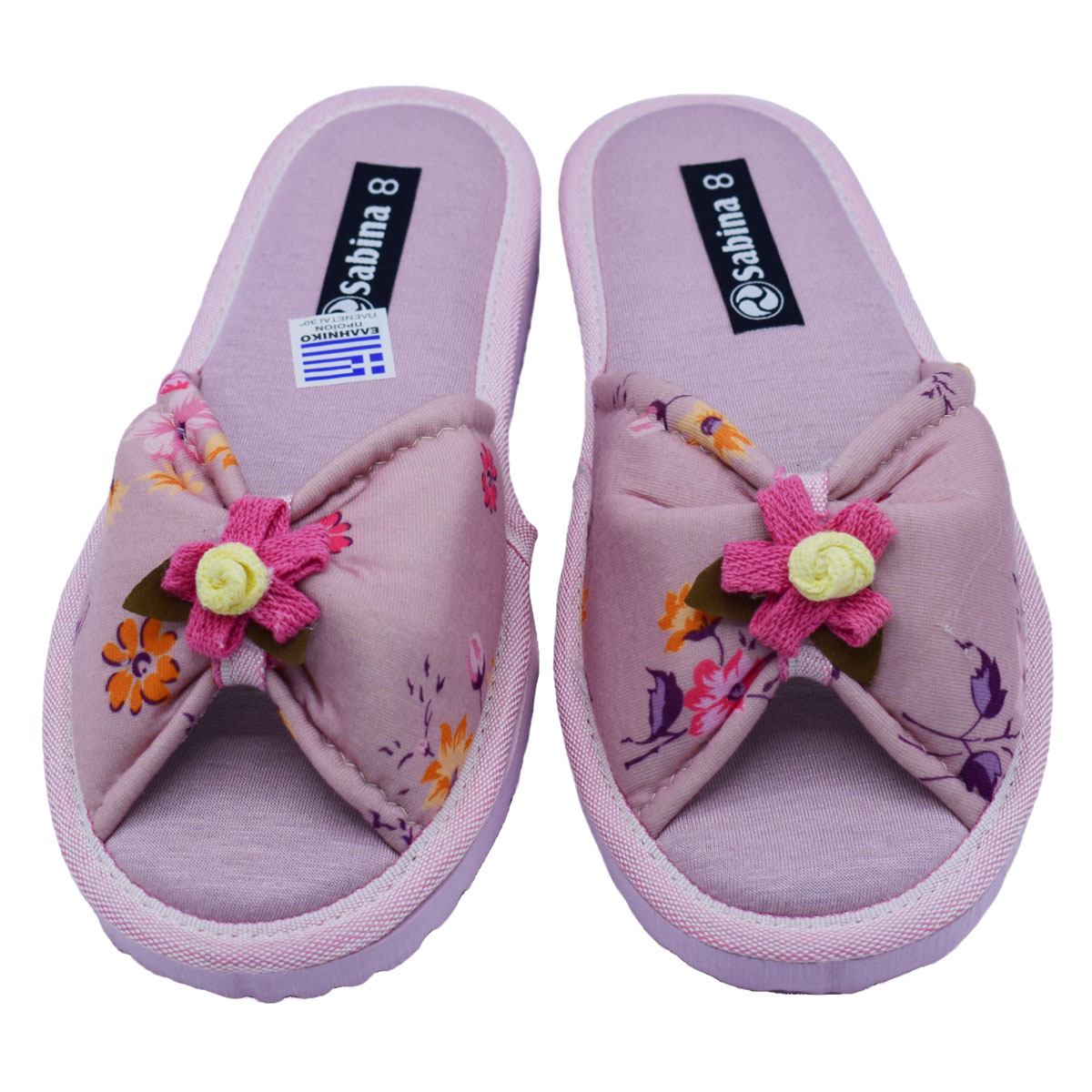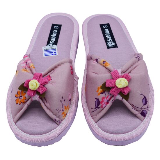 Γυναικείες υφασμάτινες Comfort παντόφλες ανοιχτές μπροστά με δέσιμο της Sabina εξαιρετικής ποιότητας .Διαθέτουν πολύ μαλακό πάτημα και αντιολισθητική σόλα. Ελληνικής κατασκευής.Πολύ μοντέρνο σχέδιο και διαχρονικό με λουλουδάκια καί δέσιμο στήν φάσα , βαμβακερο υλικό .Διαθέσιμες σε ρουά καί μήλο χρώμα.Μπορεί να πλυθεί στο πλυντήριο στους 30 βαθμούς!