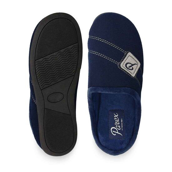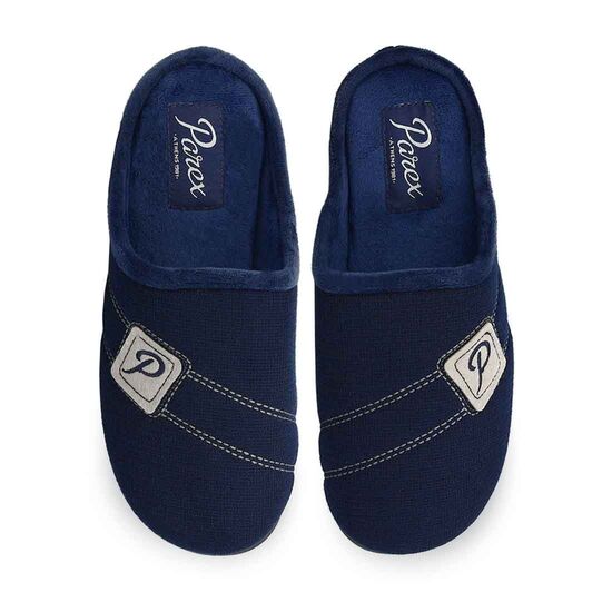 Ανδρικές παντόφλες Parex σε κλασική γραμμή με το αρχικό του logo στο πάνω μέρος , με εσωτερική επένδυση από απαλό ύφασμα και πάτο αντιολισθητικό που χαρίζει σταθερότητα όλη την ημέρα. Πλένονται στο πλυντήριο στους 30?C. Διαθέσιμες σε γκρί και μπλέ χρωμαΕξωτερικά ύφασμαΕσωτερικά ύφασμαΎψος σόλας 2,5 εκ