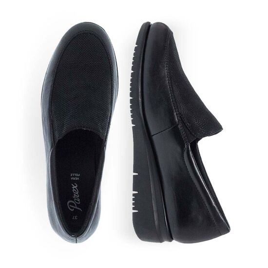 Γυναικεία δερμάτινα slip on παπούτσια Parex. Γυναικεία μαύρα slip ons με ανάγλυφη υφή και ελαστική εφαρμογή ιδανικά για πολύωρη χρήση και μοντέρνο στυλ. Τεχνολογία "p-Flex" για ευελιξία σε κάθε βήμα! Προσφέρει απόλυτη άνεση με εξαιρετικά εύκαμπτα υλικά για ομαλή κίνηση - κάνοντας το παπούτσι να μοιάζει με προέκταση του ποδιού.Γυναικεία παπούτσια, ελαφριά, μαλακά και άνετα. Σε μαύρο χρώμα