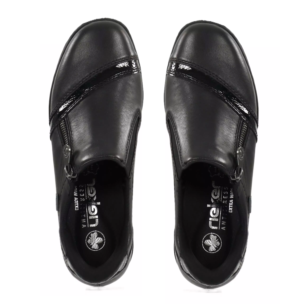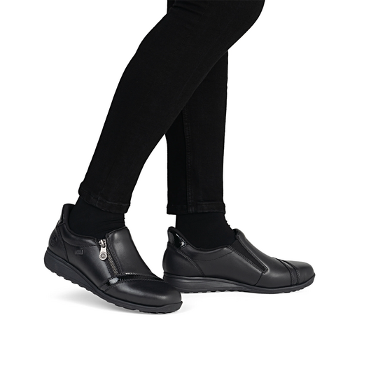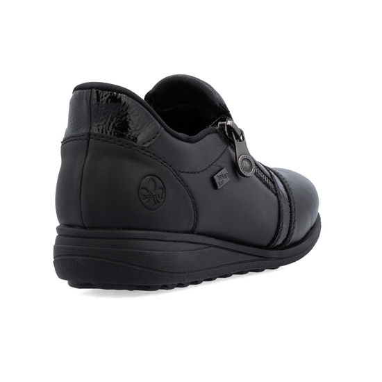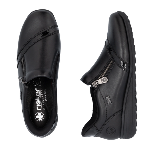Rieker γυναικεία δερμάτινα slip on παπούτσια,σχεδιασμένα από δέρμα υψηλής ποιότητας και άνετο αποσπώμενο πάτο extra wide,διαθέτουν μία προτοποριακή τεχνολογία ready 2 go που δέν χρειάζεται κάν να σκύψεις για να το φορέσεις αλλά μπαίνει χωρίς καμία βοήθεια.Είναι από τα λίγα δερμάτινα παπούτσια που είναι αδιάβροχα και έχουν ειδική επένδυση με υλικά που δεν αφήνουν το πόδι να κρυώσει.Διαθέτουν φερμουάρ στο πάνω μέρος και λουστρίνι λεπτομέρεια. Άνετα για καθημερινές chic εμφανίσεις.Διαθέσιμο σε μαύρο χρώμα