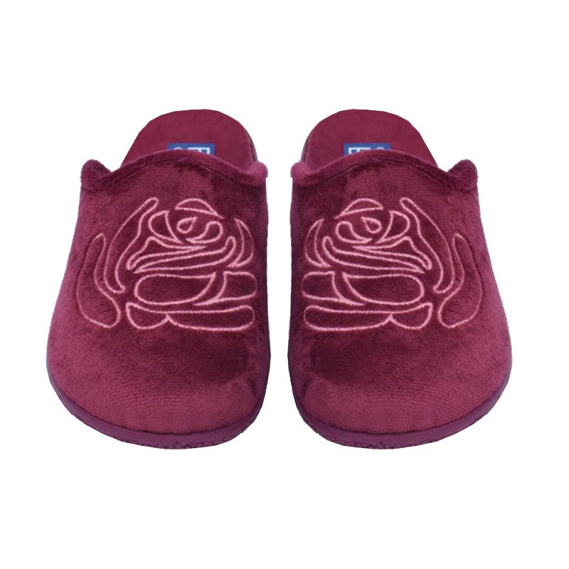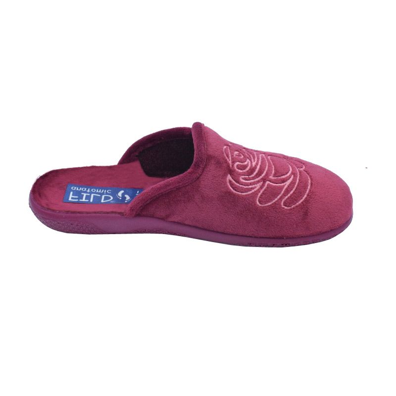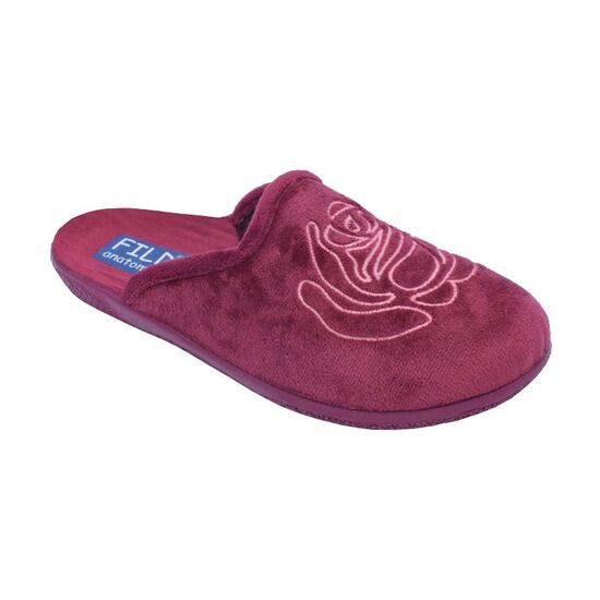 Ανατομική γυναικεία παντόφλα της εταιρίας Fild,με αντιολισθητική πολύ μαλακιά και εύκαμπτη σόλα.Ζεστό υλικό βελουτέ και απλικέ λουλουδάκι.Σόλα φλάτ.Διαθέσιμη σε μπλέ και μπορντώ και μώβ χρώμα